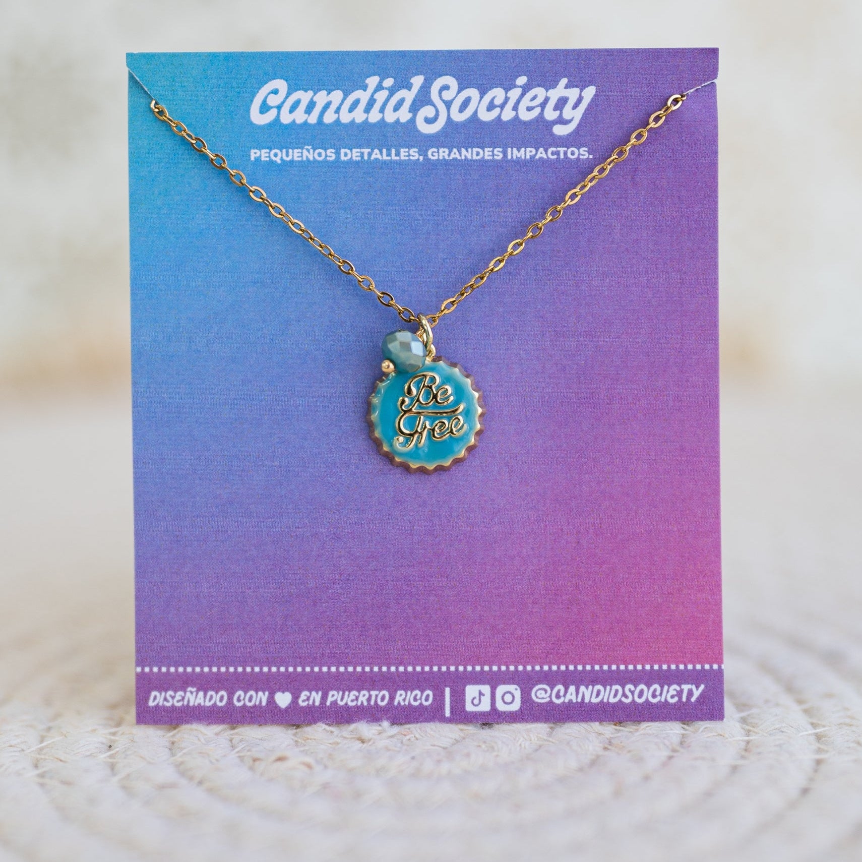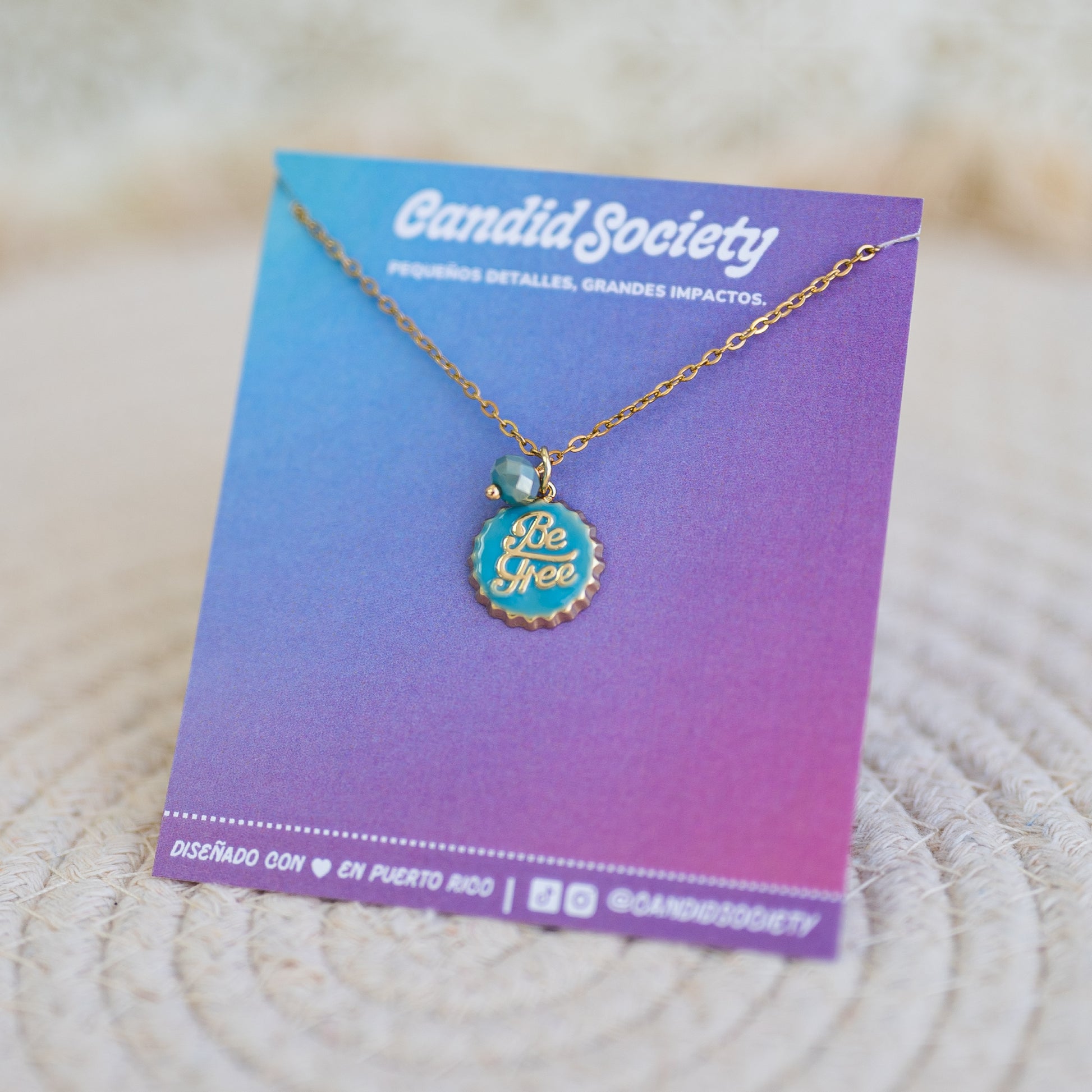 Un recordatorio sutil pero poderoso de vivir ligero y auténtico. Este collar incluye un charm circular en tono turquesa con la frase Be Free y una piedrita facetada que añade brillo y movimiento.