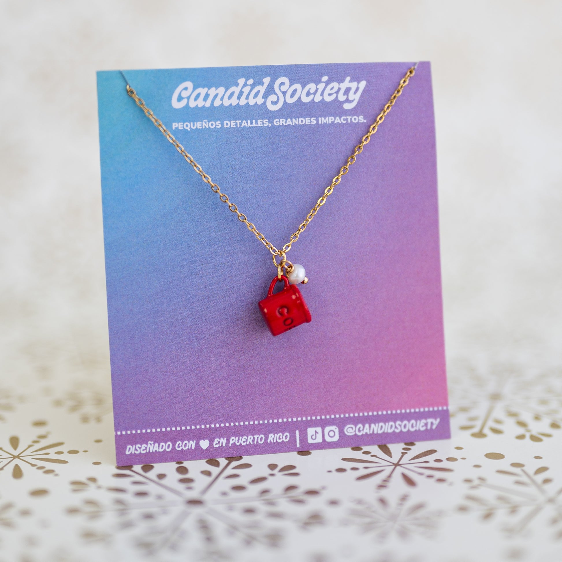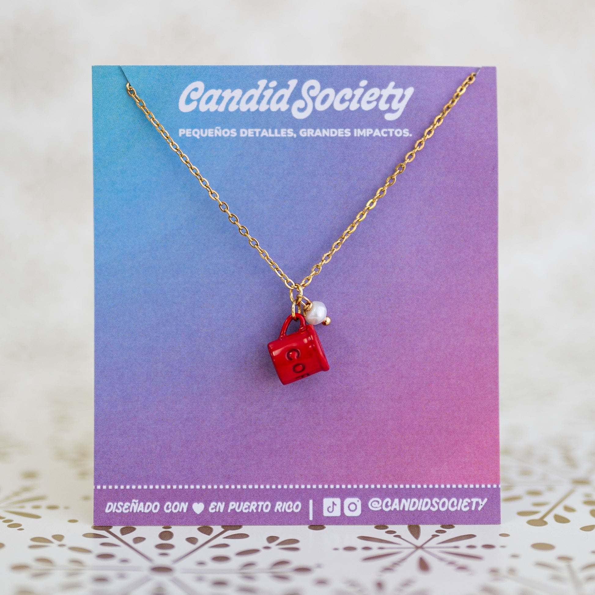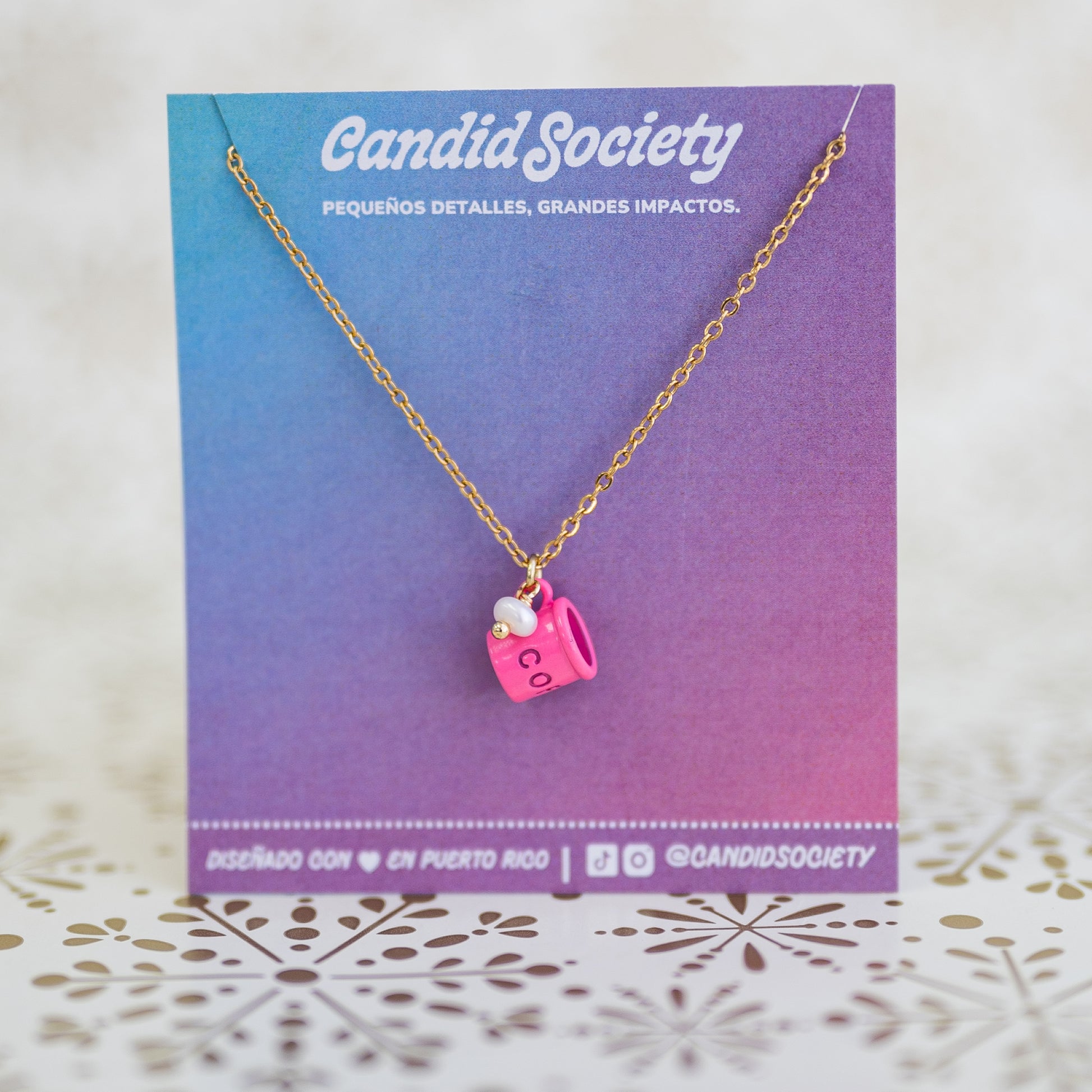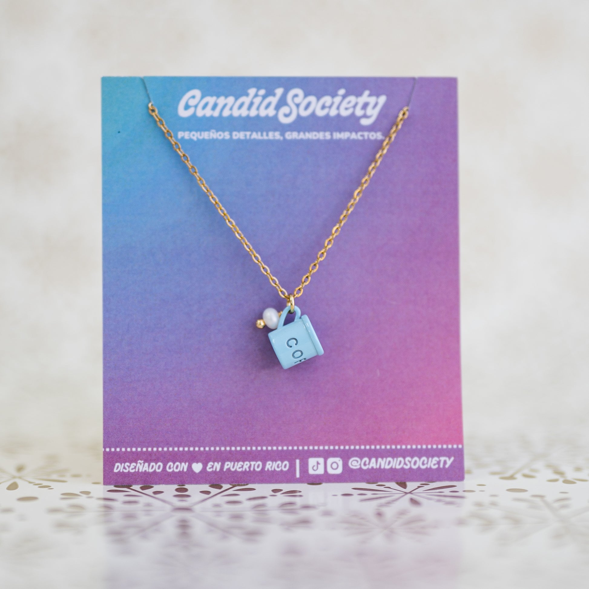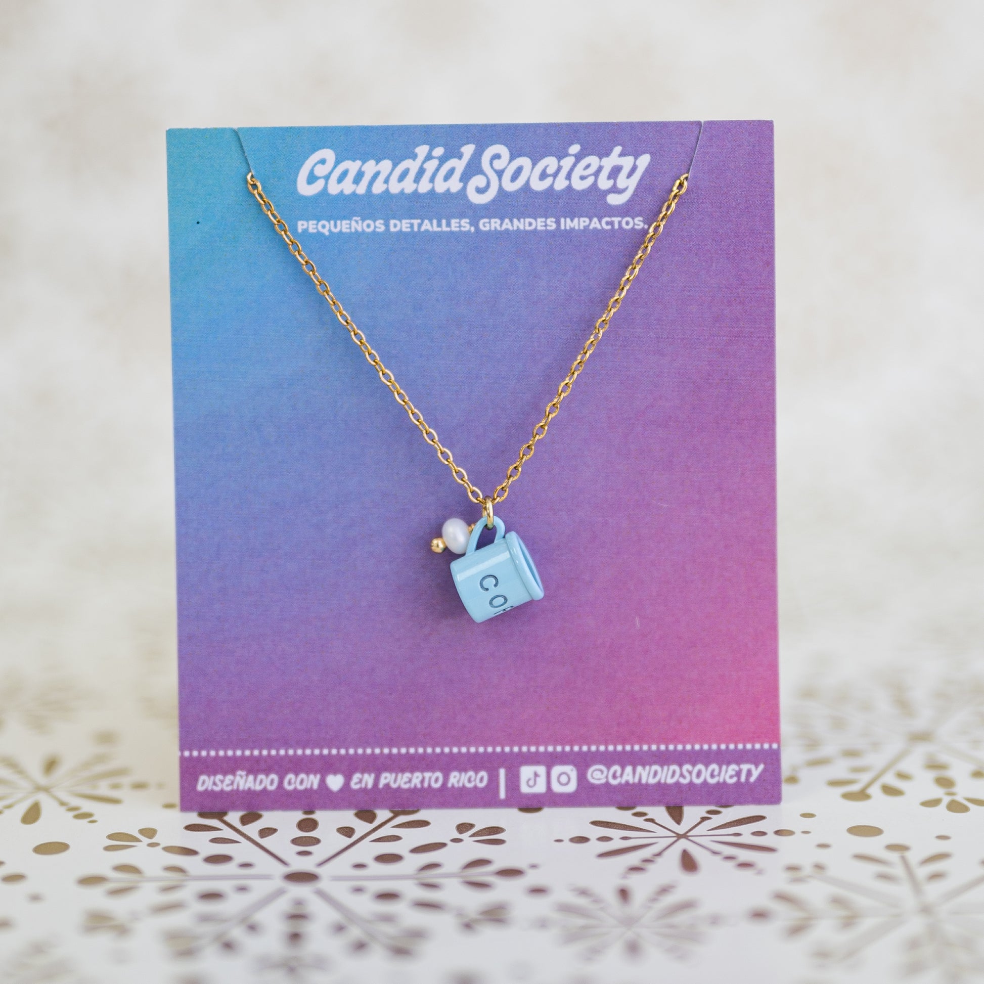 Cada collar incluye una delicada cadena dorada de acero inoxidable, ideal para uso diario porque no cambia de color. El charm de tacita mini está acompañado por un detallito perlado que le añade ese “algo extra” que tanto amamos en Candid Society.
