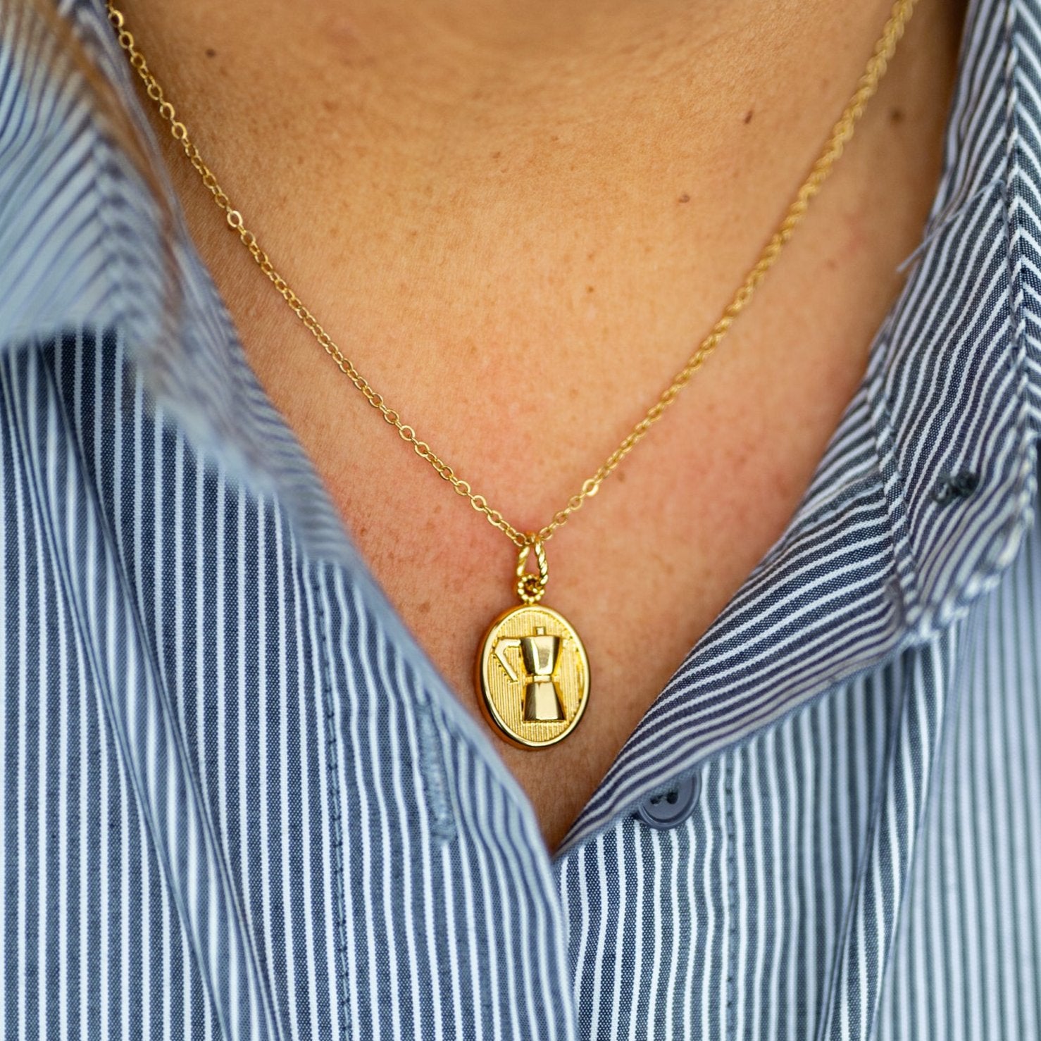 Cadena delicada con un dije en forma de vaso de café, perfecto para los amantes del café. Su diseño minimalista y elegante incluye un pequeño detalle perlado. Ideal para llevar todos los días o regalar.