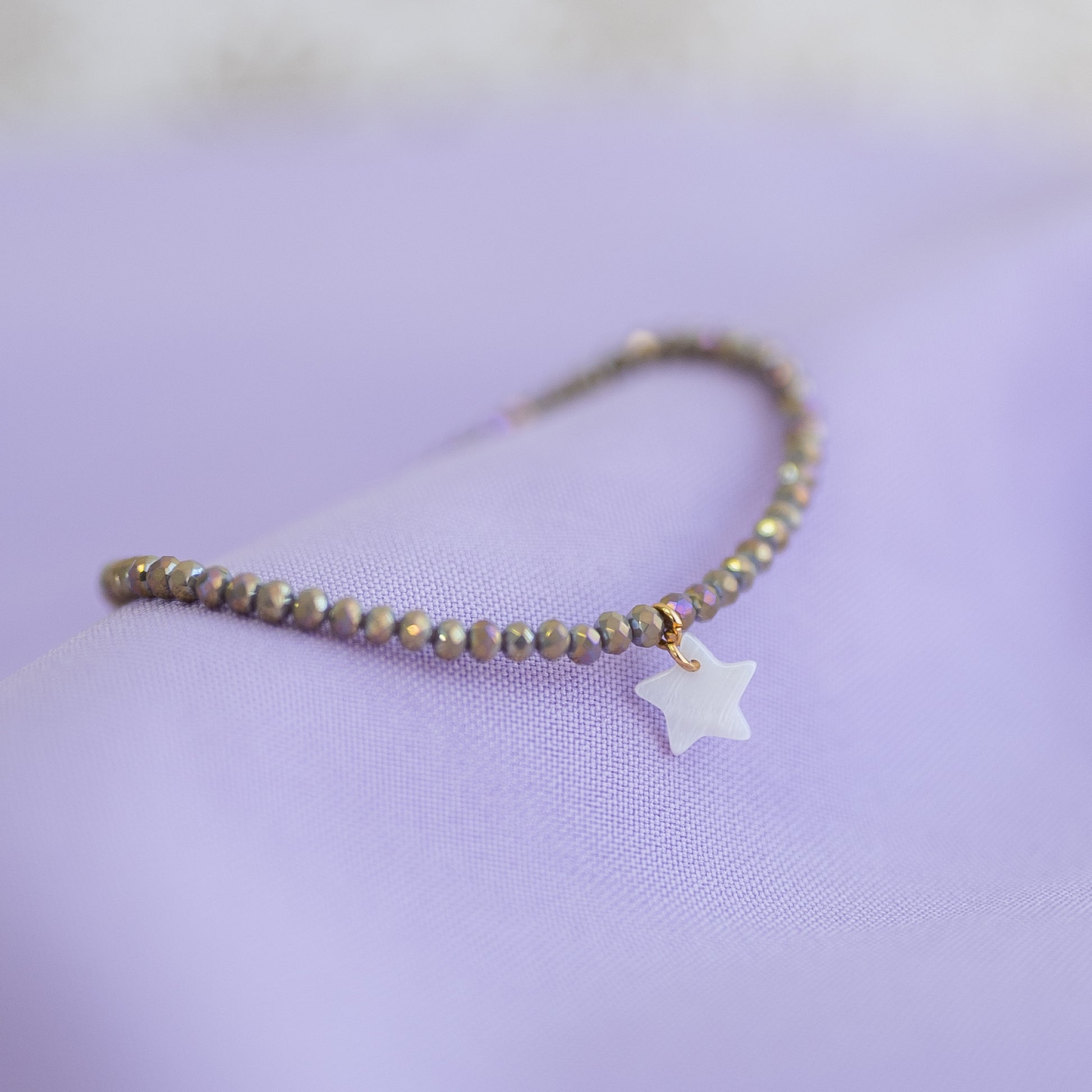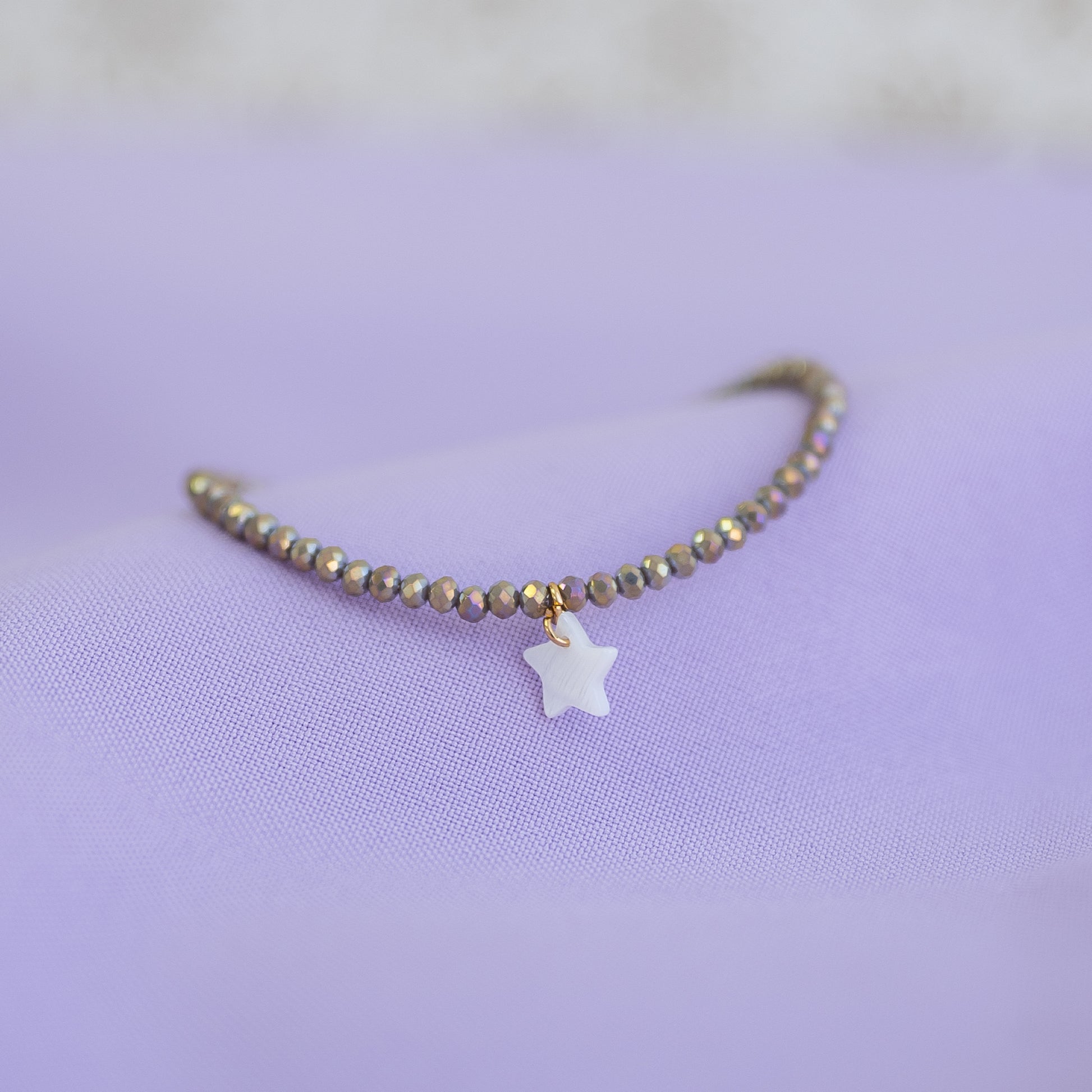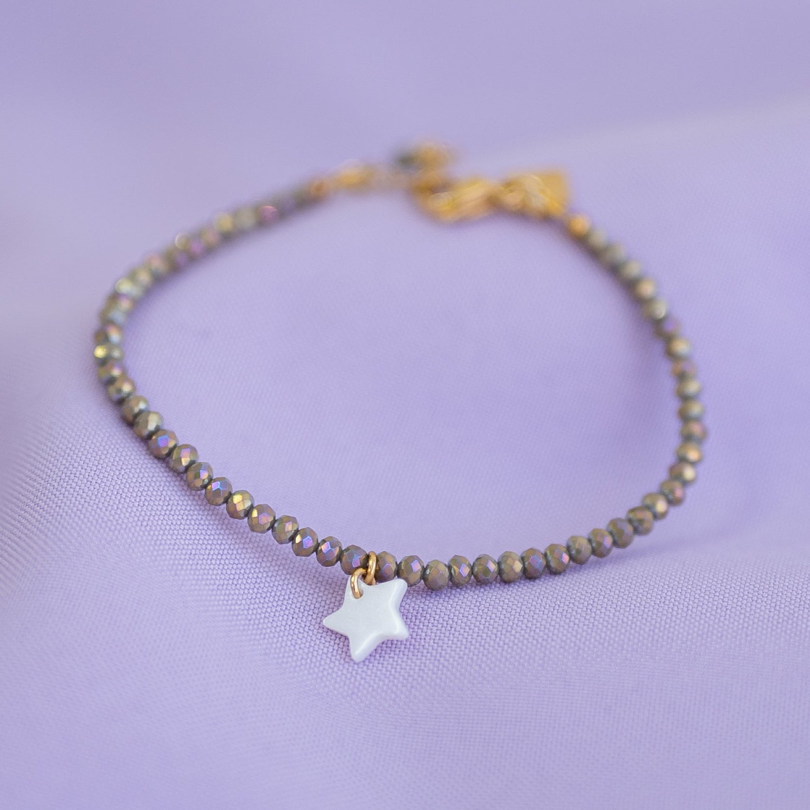 Una pulsera delicada y luminosa, hecha con cristales facetados en tonos neutros que reflejan la luz de manera preciosa. Al centro, una pequeña estrella nacarada añade un detalle suave y especial. Ajustable mediante cadenita dorada, es cómoda, ligera y perfecta para usar sola o combinada con otras pulseras. Un accesorio sutil y lleno de encanto. ✨🌟