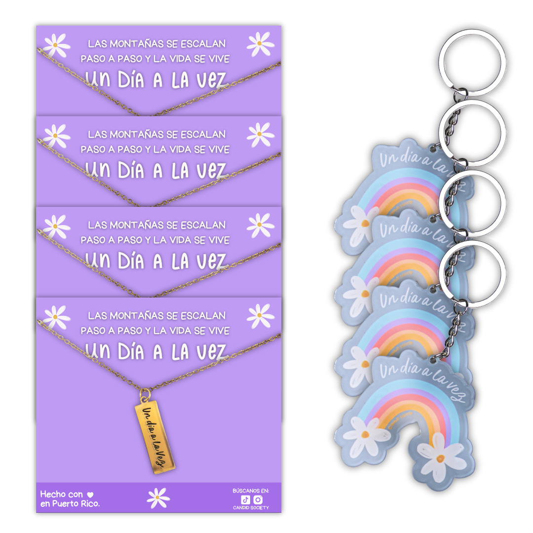 El Set de Regalo “Un Día a la Vez” incluye 4 collares y 4 llaveros con nuestro diseño icónico. Ideal para obsequiar a tu grupo de amigas, equipo de trabajo o familia.